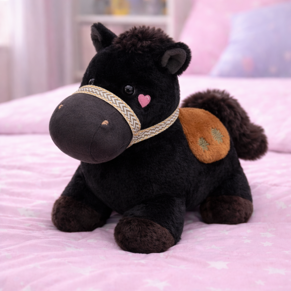 A PufiPóni fekete plüss ló egy elegáns megjelenésű, puha lovacska, aki örömet, nyugalmat és meghitt pillanatokat hoz a mindennapokba.